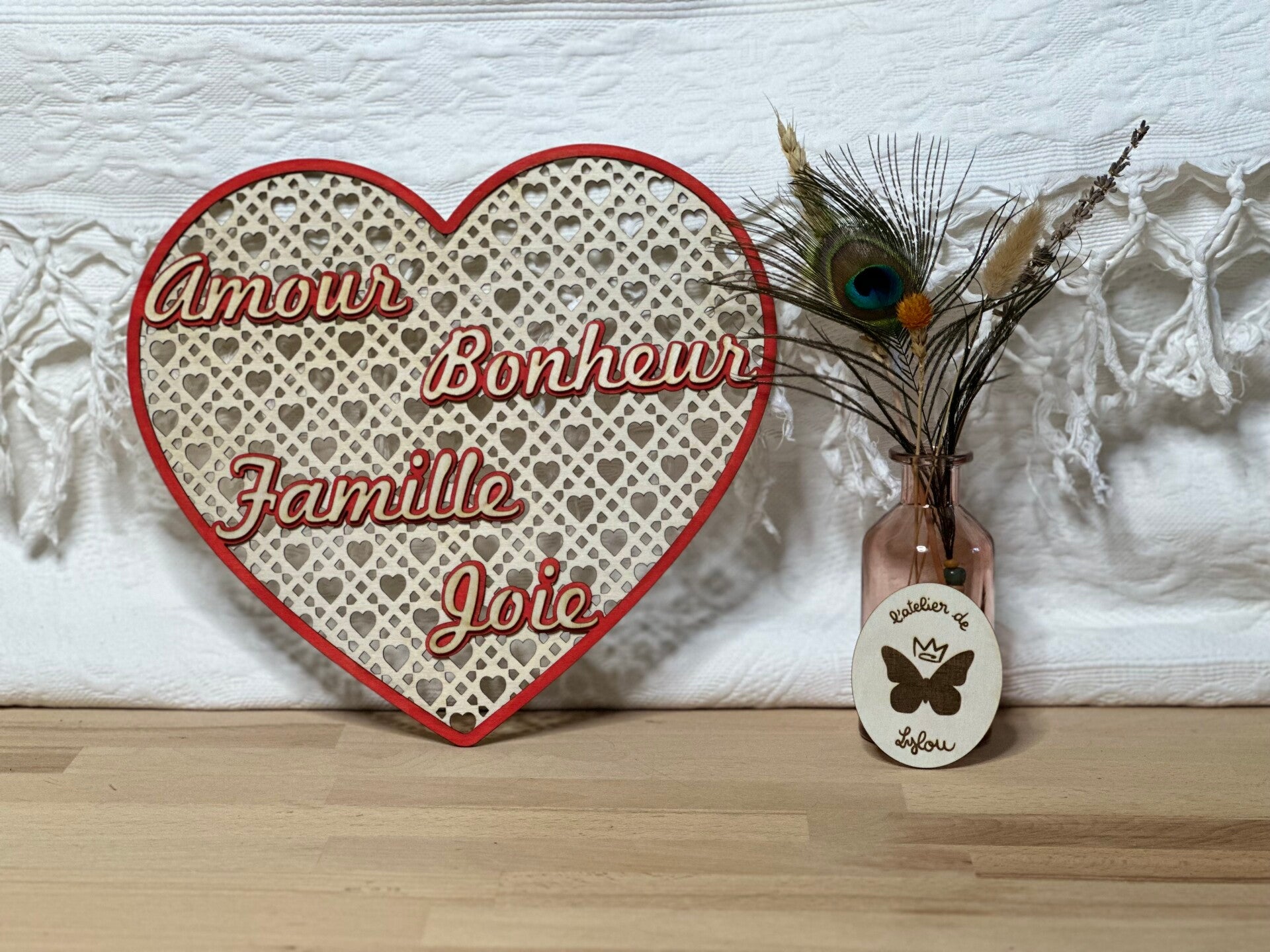 Cœur en bois “Amour, Bonheur, Famille & Joie”
