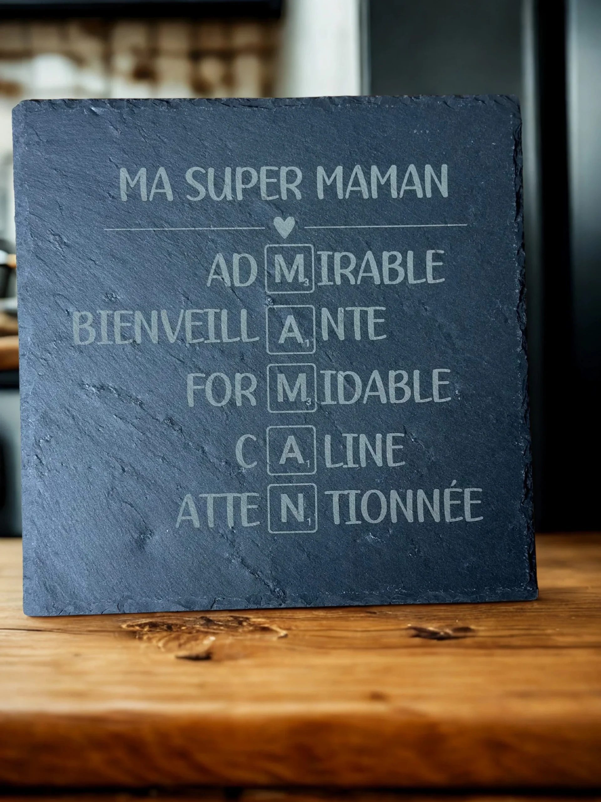 Cette plaque en ardoise naturelle reprend les lettres du mot MAMAN avec des qualités qui la décrivent parfaitement : Admirable, Bienveillante, Formidable, Câline, Attentionnée.