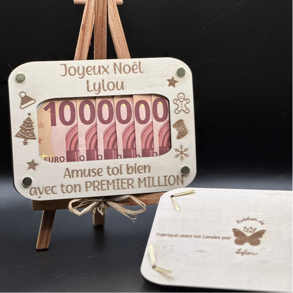 Ce cadre en bois personnalisé “Premier Million” est l’idée parfaite pour Noël : un clin d’œil plein d’humour qui cache un vrai billet (ou un faux comme sur la photo 😏), à glisser derrière la fenêtre prévue à cet effet.